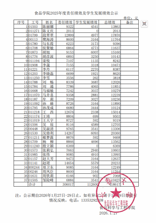 食品科学与工程学院2025年度责任绩效及学生发展绩效公示