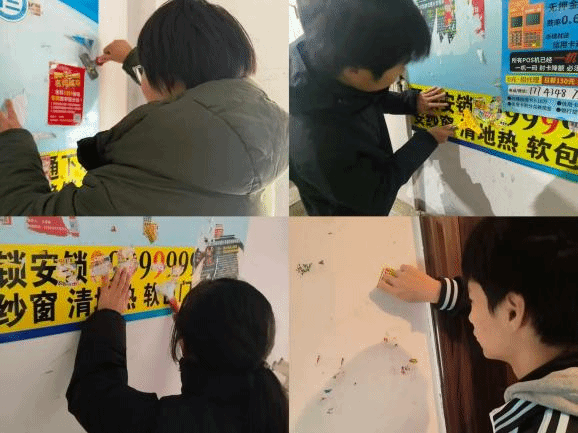 清洁行动有条不紊进行,学子们分工明确,清除楼道小广告、清运堆积杂物。有人蹲在楼道角落,用小铲一点点铲除粘牢的小广告,指甲缝里嵌进了灰也不停手;有人主动承担高层楼道清扫,提着垃圾袋逐层清理杂物;汗水浸湿了校服,却没人抱怨,用耐心和责任心改善社区环境,用行动践行爱国思想,赢得居民一致好评。